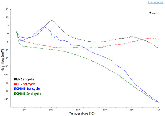 DSC curves of REF and EXPINE samples—two cycles of curing from 35 °C to 300 °C.