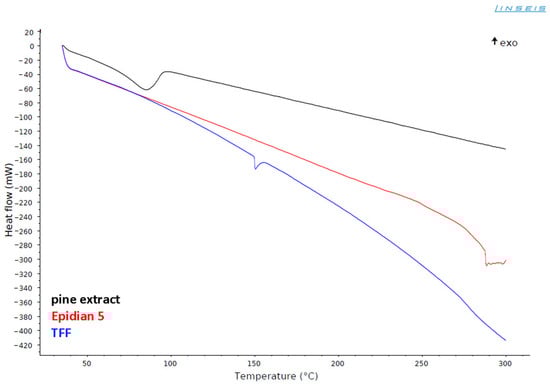 The DSC measurements were carried out using Linseis Chip-DSC 100 calorimeter (Linseis Messgeraete GmbH, Selb, Germany). Each composition was mixed and placed in 100 µL aluminium crucible (c.a 1/3 of crucible’s volume) with a lid. The samples were heated twice (1st and 2nd cycle) from 35 °C to 300 °C with heating speed 10 °C/min. REF was prepared according to producer’s suggestion—BADGE resin Epidian 5 (Sarzyna Chemical, Nowa Sarzyna, Poland) was mixed with Mannich base (MB) hardener TFF (Sarzyna Chemical, Nowa Sarzyna, Poland), containing triethylenetetramine (TETA), phenol and oligomers of the above with formaldehyde. Resin to TFF hardener ratio for REF was 100:26 (w/w). EXPINE composition was modified by replacing half the weight amount of TFF hardener with selected methanolic extract with the highest TPC (C120). Resin to TFF hardener to C120 extract ratio for EXPINE was 100:13:13 (w/w/w). More detailed information about BADGE resin and MB hardener is presented in Table 6.