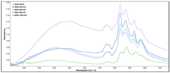 The comparison of spectra in the range from 4000 to 2650 cm−1 is presented in Figure 5. The broadband from 3600 to 3200 cm−1 (stretching vibrations of hydroxyl groups) shows a significant decrease of absorbance between the “start point” and “after 30 min” spectra. This decrease is a result of the evaporation of most of the methanol, which occurred between these measurements. The peak of this broadband is shifted to 3350 cm−1 for “after 60 min” and to 3400 cm−1 for “after 90 min” spectra compared to “after 30 min” spectra (peak at 3300 cm−1). The shift is an effect of increased content of hydroxyl groups from phenolic compounds and epoxy groups, which have undergone a chemical reaction of ring opening. The bands from 3025 to 3100 cm−1 (assigned to =C–H stretching vibrations of alkene groups, mainly from pinenes) [38] also show decreased intensity and sharpness at the time of the curing process, which suggests reactions of such groups.