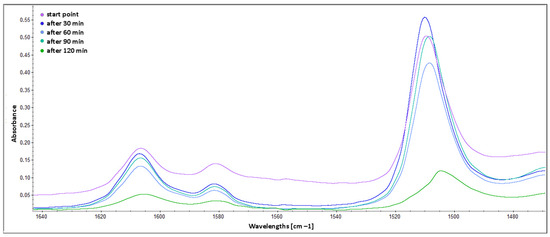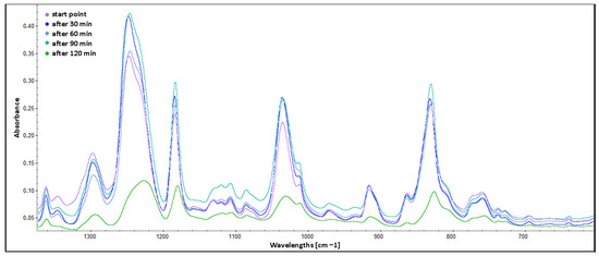 The spectra of EXPINE composition obtained at thirty-minute intervals were compared in the full range from 4000 to 550 cm−1 (Figure 4) and in smaller ranges, crucial for the analysis of the curing process. Analysis of spectra was mainly based on the Infrared Spectroscopy section from the Virtual textbook of organic chemistry by William Reusch [48]. The evaporation of methanol, observed from the start point spectrum, influences the absorbance of most of the bands, which is getting lower and peaks becoming sharper. Also, the peak around 1740 cm−1 (attributed to C=O stretching vibrations in esters) increased for “after 120 min” spectra. It results from the reaction between hydroxyl groups and carboxylic groups from polyphenolic acids (peak around 1700 for other spectra, overlapped).