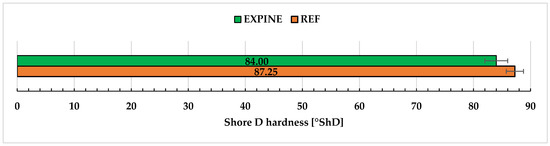 The Shore D hardness of REF and EXPINE samples were compared in Figure 9. Both compositions show good resistance to deformation by indentation (over 80°ShD), typical for the range of commercial epoxy resins (80–90°ShD). The slightly better performance of REF is not significant as they are within the margin of error, meaning EXPINE could be more competitive in coating applications.