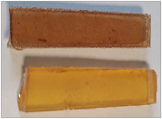 Small pieces of samples from mechanical tests were weighted using Sartorius RC210D balance (Sartorius, Göttingen, Germany) with an accuracy of 2 × 10−5 g. Then, volume changes after immersion of samples in water were read from the measuring cylinder scale (accuracy of 0.5 mL). Obtained values were used for density calculations (d = m/V). Density values and standard deviations were calculated for both compositions (each from 12 samples) using REGLINP function in Microsoft Excel (Microsoft, Redmond, WA, USA).