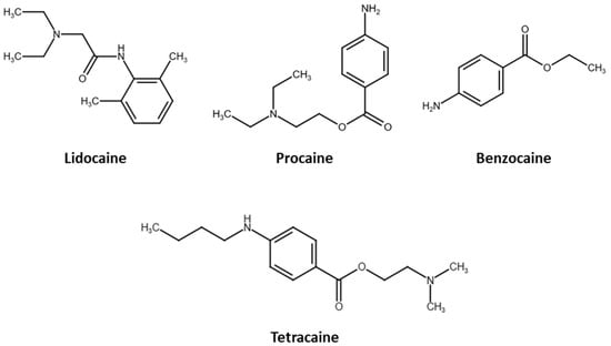 Local anesthetics are commonly used in medical and dental treatments []. However, due to their stimulant properties in the central nervous system (CNS), they are often used as adulterants of cocaine, thus there is also a forensic purpose in developing an analytical method for these substances. Local anesthetic use as a cocaine adulterant occurs because they are readily available, relatively cheap, and can mimic and even enhance the taste and effects of cocaine, masking the dilution process and the product’s poor quality [,,]. More importantly, these local anesthetics potentiate the effects of cocaine and can lead to the development of unexpected and more harmful side effects, increasing the risk of an overdose. Currently, the local anesthetics most used as cocaine adulterants are lidocaine, procaine, benzocaine, and tetracaine []. Furthermore, there are also reports of local anesthetics (i.e., lidocaine) used as a substance of abuse, and there are reports of death due to its consumption [,]. In general, these local anesthetics exhibit toxicity in the central nervous system and in the cardiovascular system. Individuals exposed to local anesthetics exhibit symptoms of CNS depression, manifesting confusion and seizures, cardiac complications such as hypotension, arrhythmia, and, in extreme cases, cardiorespiratory arrest and death [,,]. In the case of benzocaine, it can also trigger methemoglobinemia, a condition that reduces the blood’s ability to carry oxygen, resulting in cyanosis, hypoxia, and dyspnea [].