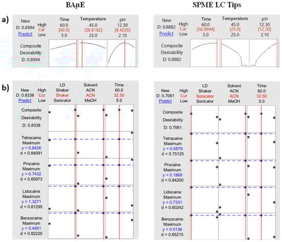 Overall BBD optimization for the extraction stage (a) and full factorial design optimization for the liquid desorption stage (b) of the procedure using BAµE devices and SPME LC Tips. y—the predicted response at the current variable settings; D—composite desirability; d—individual desirability; Cur—current variable displayed on the graphs below; LD— liquid desorption mode; time units in min and; temperature units in °C.