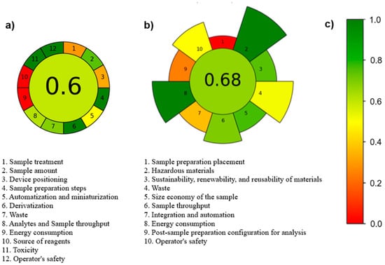 Method and sample preparation evaluation according to the analytical greenness calculator (a), AGREEprep calculator (b) and the corresponding color scale for reference (c).