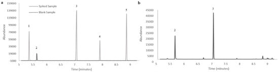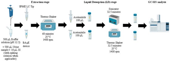 The results obtained (Figure 2a) demonstrate no significant differences between the optimal microextraction conditions for BAµE and SPME LC Tips. The equilibrium time and extraction temperature influence microextraction kinetics by potentially constraining the distribution of analytes between the bulk matrix and the sorbent phase, thus affecting the recovery yield []. In this case, the optimal microextraction time was 60 min, and the ideal temperature was 25–27 °C, for both techniques. Matrix characteristics also play an important role in the thermodynamic parameters []. One of these important characteristics is the matrix pH. Usually, the non-ionized form of the compounds seems to promote better recovery yields from aqueous media, as it favors the reverse-phase type interactions with the sorbent phases []. The results indicate that, for BAµE, the optimal pH was 8.4 and, for SPME LC Tips, the optimal pH was 12.3. Although these values are different, a pH of 12.3 was adopted for both techniques due to the satisfactory recovery yields for BAµE observed. Furthermore, from an experimental point of view, pH 12.3 is easier to prepare and keep, since that urine samples usually with acidic characteristics will be used as case studies. Additionally, according to MarvinSketch calculations [], the pH interval where all target compounds are in the non-ionized form is between 11 and 13 which theoretically favors the extraction process.
