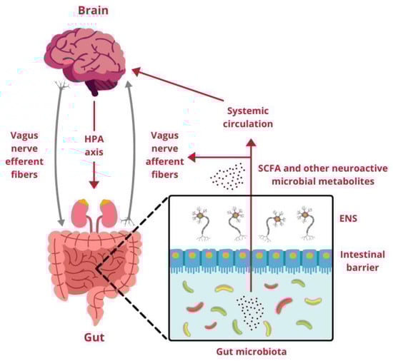 Interaction Between the gut and the brain through the gut–brain axis. HPA axis, hypothalamic-pituitary-adrenal axis; ENS, enteric nervous system; SCFA, short-chain fatty acids. Designed using elements by ©Canva, sparklestroke, Pixeden, iconsy, OpenClipart-Vectors via Canva.com (access date: 18 November 2024).