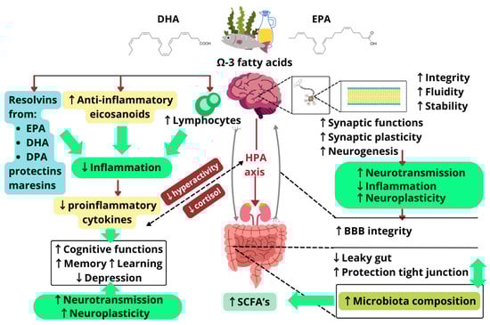 Summary of n-3 PUFAs’ mechanisms of action: a schematic representation of the possible mechanisms through which n-3 PUFAs influence the gut–brain axis. DHA—docosahexaenoic acid; EPA—eicosapentaenoic acid; DPA—n-3 docosapentaenoic acid; HPA—hypothalamic-pituitary-adrenal; BBB—blood–brain barrier; SCFAs—short-chain fatty acids. ↑ indicates an increase, ↓ indicates a decrease. Designed using elements by ©Canva, sparklestroke, Pixeden, iconsy, OpenClipart-Vectors via Canva.com (access date: 18 November 2024).