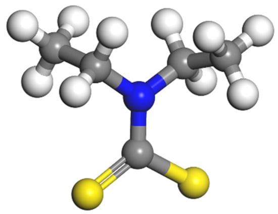 All chemicals used in this study were of analytical grade. DDTC ((C2H5)2NCSSNa) was used as the collector, and its structure is shown in Figure 3. NaOH and H2SO4 were used as pH modifiers during the microflotation experiments. Deionized (DI) water with a resistivity of 18.25 MΩ⋅cm was used throughout the tests.