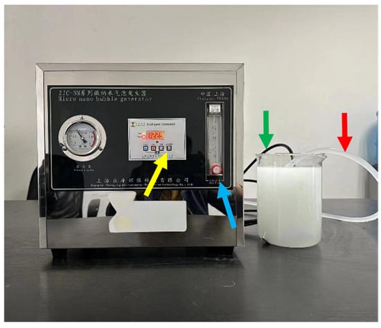 NBs were generated using a ZJC-NM-200L Micro-nano Bubble Generator (Shanghai Zong-jie Environmental Protection Technology corporation, Shanghai, China) (Figure 4). The device operates by intensely mixing water and air to create NBs via cavitation. Before operation, the water inlet tube was immersed in a beaker containing DI water. The tube, indicated by the red arrow, is the water inlet tube, whereas the tube indicated by the green arrow is the outlet tube for the NB solution. Upon activation, DI water and air were drawn into the generator through the inlet tubes, forming a high-speed gas–liquid mixture. The mixture was ejected through a specially designed nozzle under appropriate pressure, where hydrodynamic cavitation produced numerous NBs. The resulting solution initially appeared milky white. The DI water circulation time and inlet flow rate can also be adjusted. The intake volume was controlled using the knob indicated by the blue arrow, while the cavitation time was adjusted using the button indicated by the yellow arrow. After incubating for 2 min, larger bubbles ruptured and the milky white appearance disappeared, leaving a clear NB solution suitable for testing.