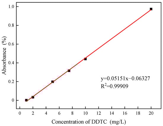 The adsorption of DDTC on the argentite surface was quantified using a T6 UV–visible spectrophotometer (Beijing PuXi General Instrument Co., Beijing PuXi General Instrument corporation, Beijing, China). Standard DDTC solutions with concentrations of 5, 10, 20, and 30 mg/L were prepared, and their absorbance values were measured to construct a standard curve (Figure 5). The linear relationship is described by the formula y = 0.05151x − 0.06327.