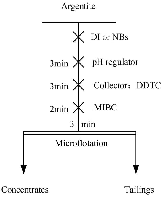 Microflotation tests were conducted using an XFGCII-type flotation machine (Jilin Prospecting Machinery Factory, Changchun, China) with a stirring speed of 1500 rpm and a flotation tank volume of 40 mL (Figure 6). For each test, 2 g of argentite was placed in a clean flotation tank. DI and NB water were then added to adjust the liquid level. The slurry was stirred for 3 min to ensure the thorough dispersion of the mineral particles. pH regulators, collectors, and frothing agents were added according to the test protocol. The mixture was stirred for a specified duration. Flotation was initiated, and the froth was collected manually by scraping. After the completion of the flotation process, the froth and residual material in the flotation tank were filtered, dried, and weighed. The weights were used to calculate the recovery rate.