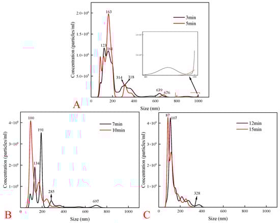 The effect of cavitation time on the concentration and size of the nanobubbles. Cavitation time: (A) 3mim, 5min; (B) 7mim, 10min; (C) 12mim, 15min.