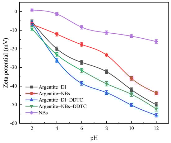 In the pH range of 4–12, the zeta potential of the argentite surface exhibited a significant negative shift after the addition of DDTC. This shift can be attributed to the adsorption of negatively charged colloidal DDTC particles onto the argentite surface. However, the presence of NBs reduced the magnitude of the negative shift in the zeta potential after the addition of DDTC compared to flotation conducted with DI water. These observations indicated that the NBs were adsorbed on the argentite surface and formed a protective layer that hindered the adsorption of DDTC.