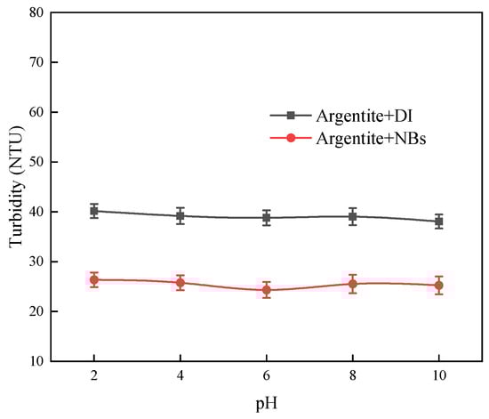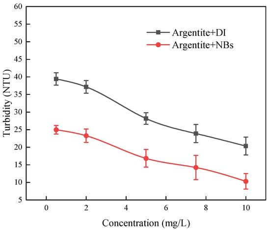 To investigate the effect of the NBs on argentite particles, we performed turbidity tests. Figure 9 shows the changes in the turbidity of the argentite slurry in DI or NB water at different pH levels. The turbidity of the argentite slurry was lower in NB water than in DI water, indicating that the argentite particles aggregated in the presence of NBs.