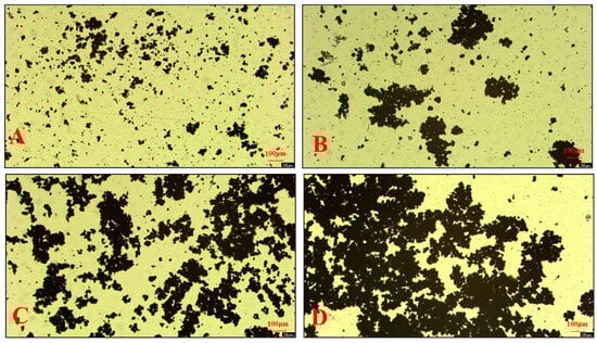 As shown in Figure 11, fewer aggregates of the argentite particles were formed in DI water (Figure 11A). However, the presence of the NBs facilitated the aggregation of argentite particles (Figure 11B). After adding 5 mg/L of DDTC to the pulp, the hydrophobic coalescence of DDTC led to the formation of irregular aggregates in DI water (Figure 11C), with a trace amount of dispersed fine particles. When both the NBs and DDTC were added, the aggregation of fine particles was significantly enhanced (Figure 11D). This effect can be attributed to the ability of the NBs to effectively overcome the electrostatic repulsion between argentite particles, resulting in the formation of large aggregates.