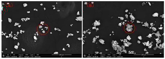 Figure 12 shows the scanning electron microscopy images of the argentite particles before and after NB adsorption. The red circle is shown in Figure 12A, the agglomeration of the argentite particles in DI water was minimal. However, the introduction of the NBs promoted the agglomeration of many dispersed argentite particles (Figure 12B red circle), resulting in the formation of large aggregates.