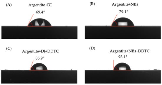 Contact angle of (A) argentite + DI; (B) argentite + NBs; (C) argentite + DI + DDTC; (D) argentite + NBs + DDTC.