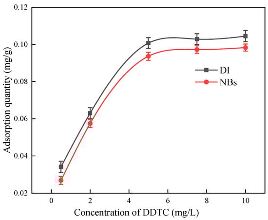 To evaluate the adsorption capacity of the argentite surface for different DDTC concentrations, we conducted measurements in both the DI and NB water systems.