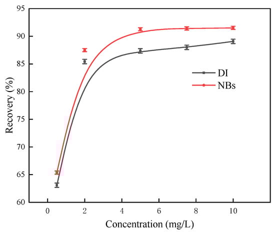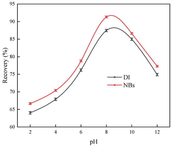 This section explores the effect of NBs on the flotation behavior of fine argentite, building on previous findings. Single-mineral flotation tests were conducted to investigate the effect of the introduction of NBs on the recovery of fine argentite. DDTC was used as the collector, and MIBC functioned as the frothing agent. Initially, we conducted tests to establish the relationship between NB flotation and varying pH and identified the optimal pH for argentite flotation. Subsequently, under optimal pH conditions, we examined the effects of varying DDTC concentrations on the argentite flotation behavior. The outcomes of conventional and NB-enhanced flotation were compared.
