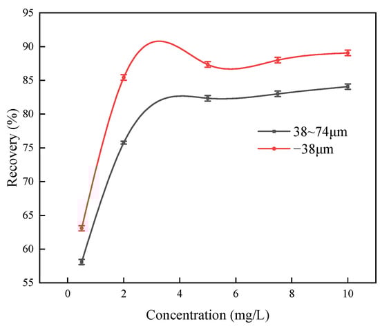 The flotation recovery of argentite with particle sizes 38 μm to 74 μm varies with DDTC concentration (pH = 8).
