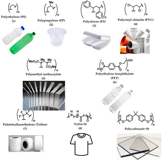 Many polymers are used in manufacturing plastics, with the most commonly used ones being mainly found in production parts and utensils (Figure 1). Monomers, the basic building blocks of polymers, are transformed into their final commercial form (e.g., packaging, furniture, parts, toys, household utensils, disposables, etc.) after being grouped together and processed, usually using heat. The most used polymers are polyethylene (PE) (1), polypropylene (PP) (2), polystyrene (PS) (3), and polyethylene terephthalate (PET) (6).