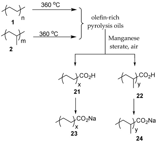Xu et al. [41] reported a relevant strategy for transforming polyethylene (1) and polypropylene (2) into fatty acids with an approximate conversion rate of 80% and average molar masses between 700 and 670 Daltons, respectively. The first stage is a temperature gradient pyrolysis that leads to the formation of waxes. The waxes are oxidized at the end of the chain with air and heating in the presence of manganese stearate, forming fatty acids (21 and 22), which can then be saponified to form soaps or surfactants (23 and 24) (Scheme 2). The authors pointed out that this process can be converted to an industrial scale with economic viability.