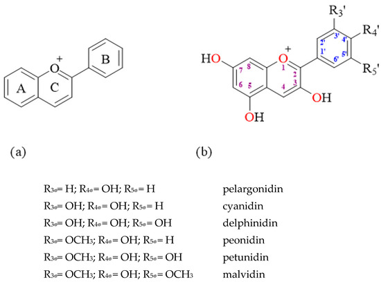 The natural anthocyanidins differ from each other in the number of hydroxyl groups attached to ring B and their degree of methylation, as well as glycosyl fragments linked at different positions of ring C or A, which may be acylated with aliphatic or aromatic acids [7].