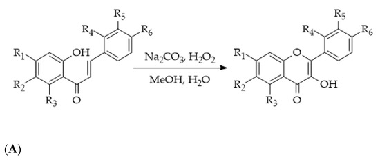 This method involves the oxidation of 2′-hydroxychalcone with hydrogen peroxide in alkaline alcohol solution. However, the reported reaction yields of 5-substituted flavonols were low [60]. As an alternative, Shen et al. used sodium carbonate with hydrogen peroxide to obtain a series (14) of 5- substituted flavonols with moderate to high yields. In terms of reaction conditions, it has been concluded that a combination of methanol/water in a ratio of 2:1 was the most effective reaction medium, and the mixture of 5 eq. sodium carbonate and 2.5 eq. hydrogen peroxide (for 1 eq. chalcone) proved to be the best base. The highest yield of 86% was obtained when R2 = R3 = R4 = R5 = H, R1 = R6 = OCH3 (Scheme 1A) [61].
