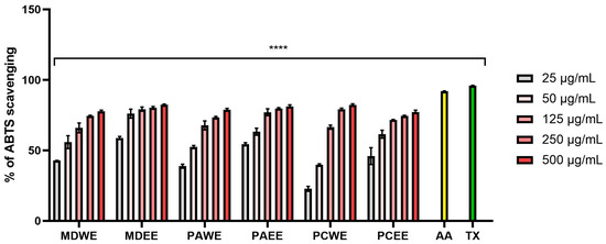 The ability of M. domestica, P. armeniaca, and P. cerasus leaf extracts to scavenge ABTS free radicals at concentrations of 25, 50, 125, 250, and 500 µg/mL. This study used extracts from M. domestica leaves (water (MDWE), water–ethanol (MDEE)), extracts from P. armeniaca leaves (water (PAWE), water–ethanol (PAEE)), and extracts from P. cerasus leaves (water (PCWE), water–ethanol (PCEE)). Ascorbic acid (AA, 100 µg/mL) and Trolox (TX, 100 µg/mL) were used as reference compounds. Data are presented as mean ± SD from three independent experiments, with each sample tested in triplicate **** p < 0.0001.