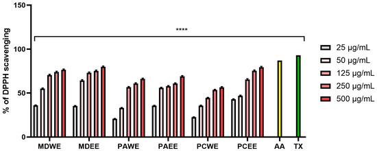 The ability of M. domestica, P. armeniaca, and P. cerasus leaf extracts to scavenge DPPH free radicals at concentrations of 25, 50, 125, 250, and 500 µg/mL. This study used extracts from M. domestica leaves (water (MDWE), water–ethanol (MDEE)), extracts from P. armeniaca leaves (water (PAWE), water–ethanol (PAEE)), and extracts from P. cerasus leaves (water (PCWE), water–ethanol (PCEE)). Ascorbic acid (AA, 100 µg/mL) and Trolox (TX, 100 µg/mL) were used as reference compounds. Data are presented as mean ± SD from three independent experiments, with each sample tested in triplicate **** p < 0.0001.