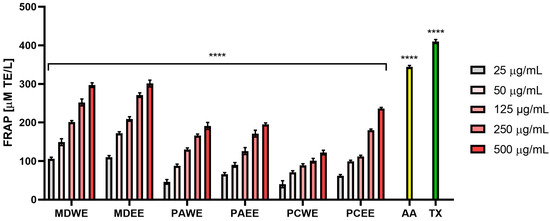 Antioxidant capacity in FRAP assay of M. domestica, P. armeniaca, and P. cerasus leaf extracts at concentrations of 25, 50, 125, 250, and 500 µg/mL. This study used extracts from M. domestica leaves (water (MDWE), water–ethanol (MDEE)), extracts from P. armeniaca leaves (water (PAWE), water–ethanol (PAEE)), and extracts from P. cerasus leaves (water (PCWE), water–ethanol (PCEE)). Ascorbic acid (AA, 100 µg/mL) and Trolox (TX, 100 µg/mL) were used as reference compounds. Data are presented as mean ± SD from three independent experiments, with each sample tested in triplicate **** p < 0.0001.