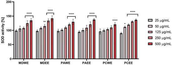 Effect of M. domestica, P. armeniaca, and P. cerasus leaf extracts at concentrations of 25, 50, 125, 250, and 500 µg/mL on superoxide dismutase (SOD) activity. This study used extracts from M. domestica leaves (water (MDWE), water–ethanol (MDEE)), extracts from P. armeniaca leaves (water (PAWE), water–ethanol (PAEE)), and extracts from P. cerasus leaves (water (PCWE), water–ethanol (PCEE)). Data are presented as mean ± SD of three independent experiments, with each sample tested in duplicate. **** p < 0.0001, ** p = 0.0038, * p = 0.0313.