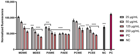 The effect of M. domestica, P. armeniaca, and P. cerasus leaf extracts at the concentrations of 25, 50, 125, and 250 µg/mL on the intracellular level of reactive oxygen species in fibroblasts (HDF cells). The analyses were performed for M. domestica leaf extracts (water (MDWE), water–ethanol (MDEE)), P. armeniaca leaf extracts (water (PAWE), water–ethanol (PAEE)), and P. cerasus leaf extracts (water (PCWE), water–ethanol (PCEE)). Data are presented as mean ± SD from three independent experiments, with each sample tested in triplicate. **** p < 0.0001, *** p < 0.001.