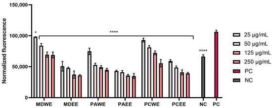 The reduction in resazurin after 24 h exposure to M. domestica, P. armeniaca, and P. cerasus water and water–ethanol extracts in cultured fibroblasts. The analyses were performed for M. domestica leaf extracts (water (MDWE), water–ethanol (MDEE)), P. armeniaca leaf extracts (water (PAWE), water–ethanol (PAEE)), and P. cerasus leaf extracts (water (PCWE), water–ethanol (PCEE)). The control consisted of cells not treated with the extracts. Data are the means ± SDs of three independent experiments, in which each sample was tested in three replicates. **** p < 0.0001, *** p = 0.0001, ** p < 0.01, * p < 0.05.