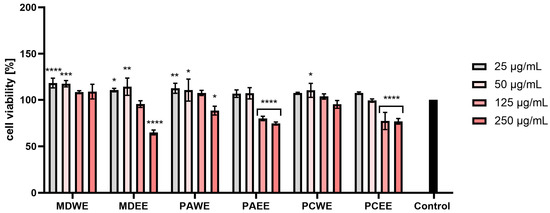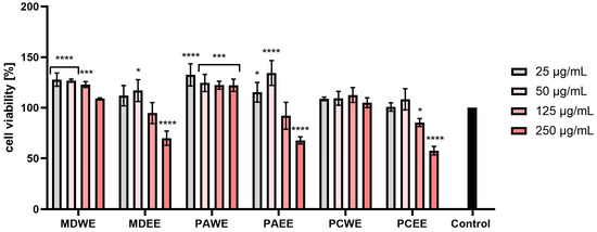 In the case of the AB test performed on HaCaT cells, a similar trend was observed as in the case of HDF cells. MDWE and PAWE extracts stimulated the viability of the tested cells at all applied concentrations. Slightly lower viability values were observed for PCWE, but in the case of this extract, the two highest concentrations resulted in slightly lower viability compared to the control cells. In the case of MDEE, PAEE, and PCEE, the ability to increase cell viability was observed for the lowest tested concentration, while with the increase of the extract concentration in the culture medium, the viability of keratinocytes decreased. For these extracts, in the case of a 250 µg/mL concentration, a decrease in viability of up to about 40% was observed (Figure 8).