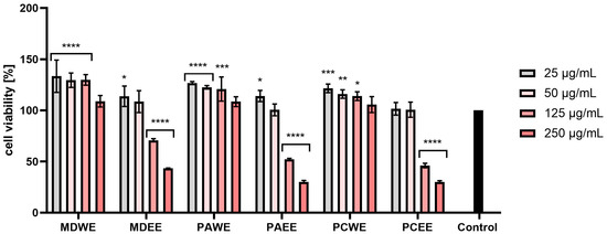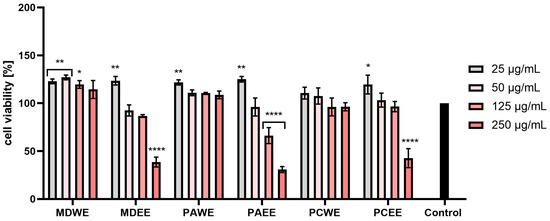 In the AB test conducted on human fibroblasts (HDF), an increase in the viability of these cells was observed after the use of lower concentrations of the tested extracts. The MDWE extract gave higher results than the control in all tested concentrations. In the case of PAWE and PCWE, the viability dropped below the control cells only for the highest concentrations used (250 µg/mL). However, the use of concentrations in the range of 25–125 µg/mL resulted in an increase in the viability of fibroblasts. In the case of other extracts, such as MDEE, PAEE, and PCEE, the two lowest concentrations stimulated the viability of the analyzed cells, and the highest viability was observed for MDWE. Based on the obtained results, a general conclusion can be drawn that, in all the cases tested, lower concentrations had a more beneficial effect on the viability of the tested cells. Increased cytotoxicity at higher concentrations was observed mainly for ethanol extracts (MDEE, PAEE, and PCEE), in which concentrations above 50 µg/mL showed a statistically significant cytotoxic effect (Figure 7).