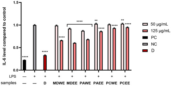 The influence of M. domestica, P. armeniaca, and P. cerasus leaf extracts after exposure to bacterial lipopolysaccharide on interleukin 6 (IL-6) levels. The analyses were performed for M. domestica leaf extracts (water (MDWE), water–ethanol (MDEE)), P. armeniaca leaf extracts (water (PAWE), water–ethanol (PAEE)), and P. cerasus leaf extracts (water (PCWE), water–ethanol (PCEE)) as well as diclofenac (D). Data means ± SD from three independent experiments, in which each sample was tested in duplicate. **** p < 0.0001, ** p < 0.01.
