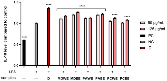 This study also determined the level of anti-inflammatory activity of interleukin 10, which is a key mediator in inhibiting the inflammatory response. The results shown in Figure 12 indicate that MDEE at a 125 µg/mL concentration achieved the most favorable effect on the activity of the cytokine, reaching 1.27 ± 0.015 -fold compared to the control, respectively. The significant values in the levels of the tested cytokine were also observed in MDWE at a 125 µg/mL concentration and PAEE at both concentrations tested.
