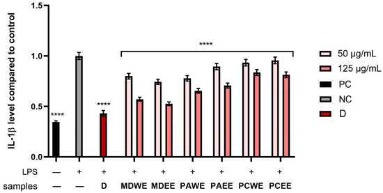 The influence of M. domestica, P. armeniaca, and P. cerasus leaf extracts after exposure to bacterial lipopolysaccharide on interleukin 1β (IL-1β) levels. The analyses were performed for M. domestica leaf extracts (water (MDWE), water–ethanol (MDEE)), P. armeniaca leaf extracts (water (PAWE), water–ethanol (PAEE)), and P. cerasus leaf extracts (water (PCWE), water–ethanol (PCEE)), as well as diclofenac (D). Data means ± SD from three independent experiments, in which each sample was tested in duplicate. **** p < 0.0001.