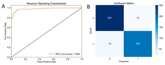 The ROC curve reflects the classification performance of the model under different thresholds [32]. It was observed from Figure 1A, it rose steeply and approached the upper left corner, indicating that the model was able to balance ‘high recall’ and ‘low false positives’ in most cases (i.e., the False Positive Rate was close to 0, and the True Positive Rate was close to 1). The AUC score of 0.9740 further substantiated the efficacy of the model, classifying it as performing at a high level of accuracy.