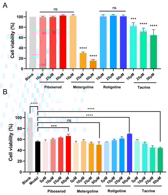 (A) Toxicity of piboserod, Metergoline, and Rotigotine on PC-12 cells at 10, 25, and 50 μM; (B) Protective effect of piboserod, Metergoline, and Rotigotine against hydrogen peroxide-induced PC-12 cell damage. (The data are expressed as mean ± SD of three independent experiments. *** means p < 0.001; **** means p < 0.0001; ns means no significant difference).