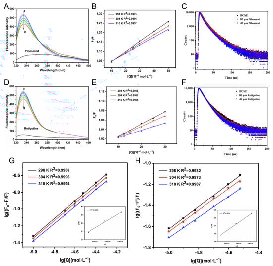 (A) Fluorescence-quenching spectra of BChE (5 U·mL−1) in the presence of piboserod, with varying concentrations at 298 K, c(piboserod) = 0, 10, 20, 25, 30, 40, and 50 μM for curves a → g, respectively; (B) The Stern-Volmer plots for the fluorescence quenching of BChE by piboserod at 298, 304, and 310 K; (C) Time-resolved fluorescence decay curve of the piboserod-BChE system; (D) Fluorescence quenching spectra of BChE (5 U·mL−1) in the presence of Rotigotine, with varying concentrations at 298 K, c(Rotigotine) = 0, 10, 12, 15, 20, 25, and 30 μM for curves a → g, respectively; (E) The Stern-Volmer plots for the fluorescence quenching of BChE by Rotigotine at 298, 304, and 310 K; (F) Time-resolved fluorescence decay curve of the Rotigotine-BChE system; The Stern-Volmer bilogarithmic plots for the fluorescence quenching of BChE by piboserod (G) and Rotigotine (H) at 298, 304, and 310 K, the secondary plots represent Van’t Hoff plots for the interaction of each with BChE.