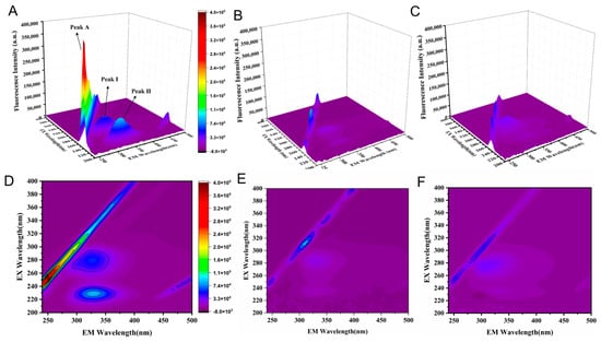 3D fluorescence spectra of BchE (A), BChE–piboserod system (B) and BChE–Rotigotine system (C), c(BChE) = 0.2 U·mL−1, c(piboserod) = 50 μM, c(Rotigotine) = 50 μM; Contour plots of 3D fluorescence spectra of BchE (D), BChE–piboserod system (E) and BChE–Rotigotine system (F).