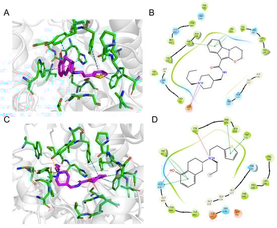 The following supporting information can be downloaded at: https://www.mdpi.com/article/10.3390/molecules30102093/s1, Figure S1: 2D interaction schematic of co-crystal ligand (A), Tacrine (B), Donepezil (C) and Galantamine (D) with BChE. Hydrogen bonds were shown as purple lines, salt bridge was shown as a pink violet gradient, π-π stacking interactions were in green lines, π-ion bonds were in red lines; Figure S2: Inhibition curves of piboserod (A), Metergoline (B) and Rotigotine (C); Table S1: ADME prediction results and BBB score of piboserod, Metergoline, Rotigotine and positive controls.