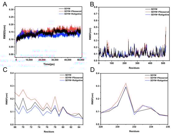 (A) RMSD analysis for piboserod-BChE and Rotigotine-BChE complexes; (B) RMSF plot of each residue in piboserod-BChE and Rotigotine-BChE complexes; (C,D) RMSF plot of the key residues in complexes piboserod-BChE and Rotigotine-BChE obtained from the full RMSF plot.