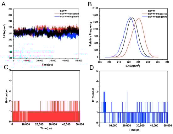 Time course (A) and relative distribution frequency (B) of SASA in piboserod-BChE and Rotigotine-BChE complexes; Number of hydrogen bonds between BChE and piboserod (C) and Rotigotine (D).