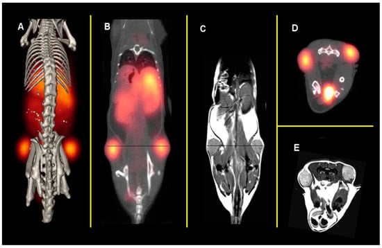 Whole-body, small animal PET/CT of PC-3 tumor-bearing mice using [[64Cu]-NOTA-8-Aoc-BBN(7-14)NH2] radiotracer. (A) Small animal coronal PET/CT; (B) small animal coronal PET/CT slice; (C) small animal coronal MRI; (D) small animal transaxial PET/CT slice; (E) small animal transaxial MRI. Figure adapted and modified from reference [17].