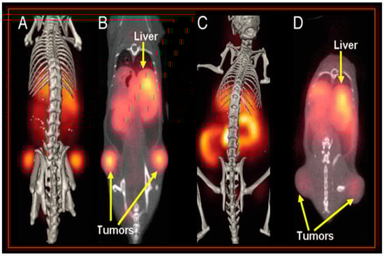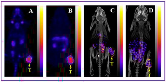 Representative coronal PET images of B16/F10 melanoma-bearing C57 mice using [Al[18F]F-NOTA-PEG2Nle-CycMSHhex] ((A), 2 h post-injection) and [[64Cu]Cu-NOTA-PEG2Nle-CycMSHhex] ((B), 2 h post-injection) as imaging probes, respectively; representative maximum intensity projection SPECT/CT images of B16/F10 melanoma-bearing C57 mice using [[99mTc]Tc(CO)3-NOTA-PEG2Nle-CycMSHhex] ((C), 2 h post-injection) and [[67Cu]Cu-NOTA-PEG2Nle-CycMSHhex] ((D), 4 h post-injection) as imaging probes, respectively. Melanoma lesions (T) are highlighted with arrows on images. Figure adapted and modified with permissions from references [97,98,99,100].