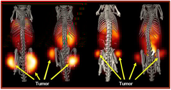 A complete structure–activity relationship study for [[64Cu]Cu-NOTA-X-(7-14)NH2] that included additional pharmacokinetic-modifying linkers including para-aminobenzoic acid (AMBA) was promising, showing high uptake and retention in tumors [50]. [[64Cu]Cu-NOTA-AMBA-BBN(7-14)NH2] showed uptake in xenografted tumors of 6.05 ± 1.15, 3.66 ± 0.54, and 2.54 ± 0.48% ID/g at 1, 4, and 24 h p.i., respectively. Whole-body, small animal PET images showed very high tumor uptake in tumor-bearing PC-3 with little or no accumulation of radiotracer in surrounding, collateral tissues at 18 h p.i. (Figure 4) [59].